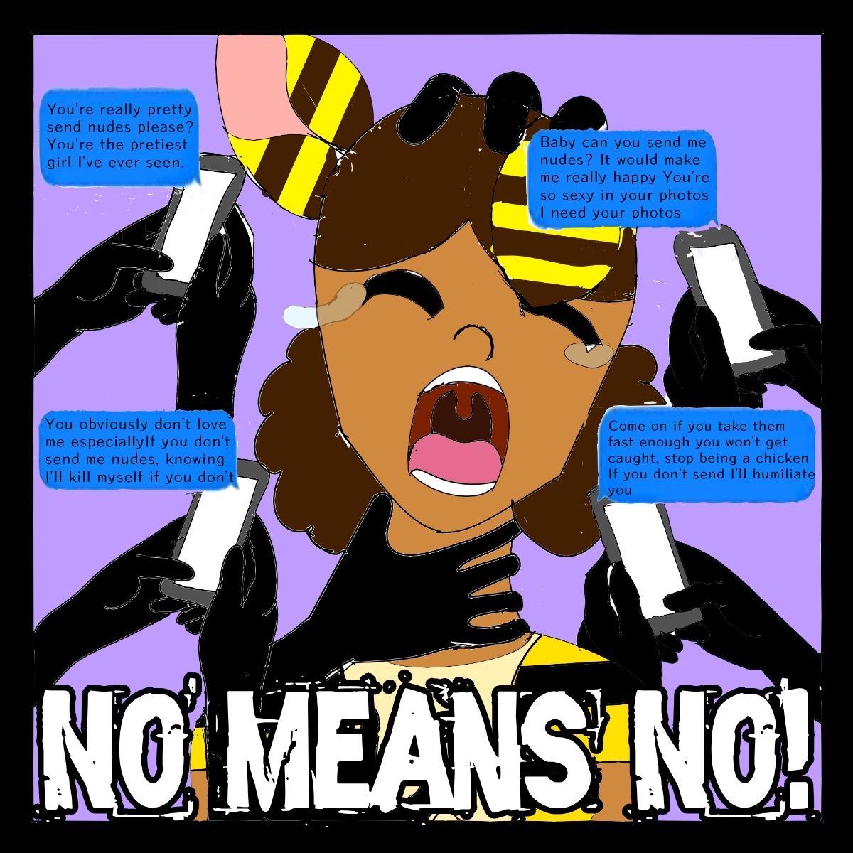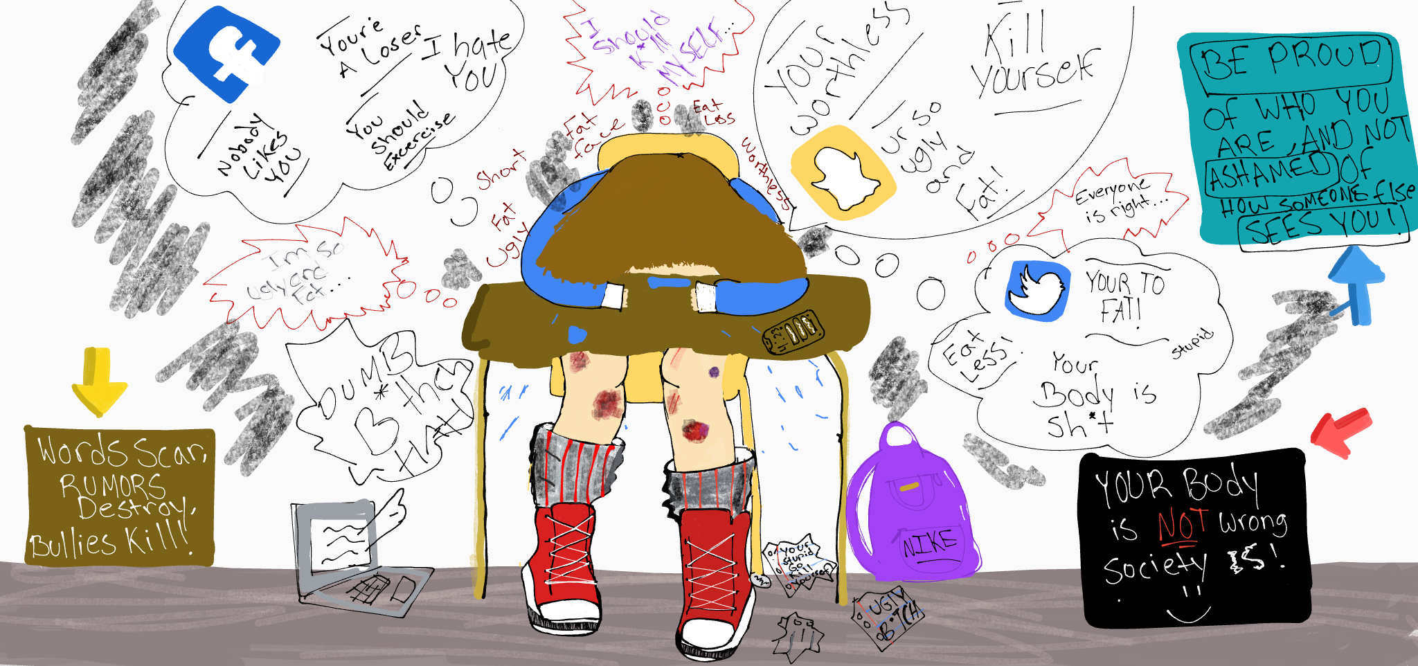 My statement of this art is about cyber bullying and body shaming the reason i made this is because it happens a lot in real life and its really sad but this is my art to represent my voice to stop that we need to spread positivity and not negativity.I decided to it because its really unfortunat when that happen to family’s so i wanted to turn it into art.