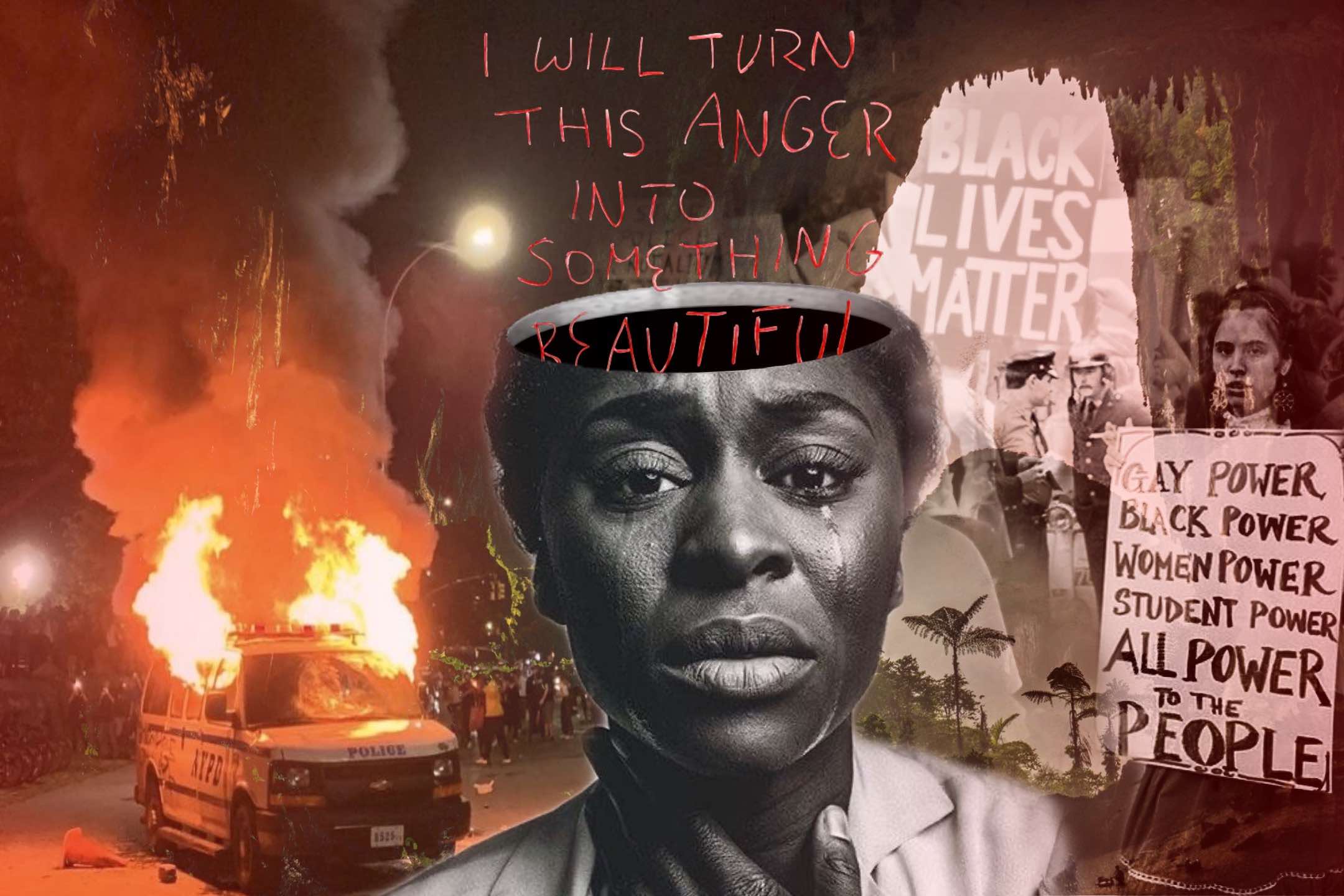 The woman in the middle represents every person, especially black people, affected, and traumatized, by a person death from police brutality. Fear. Wondering if this would be the day they get pulled over, to be shot and killed by police. Or wondering if they’ll die on this little jog they’re gonna do today.