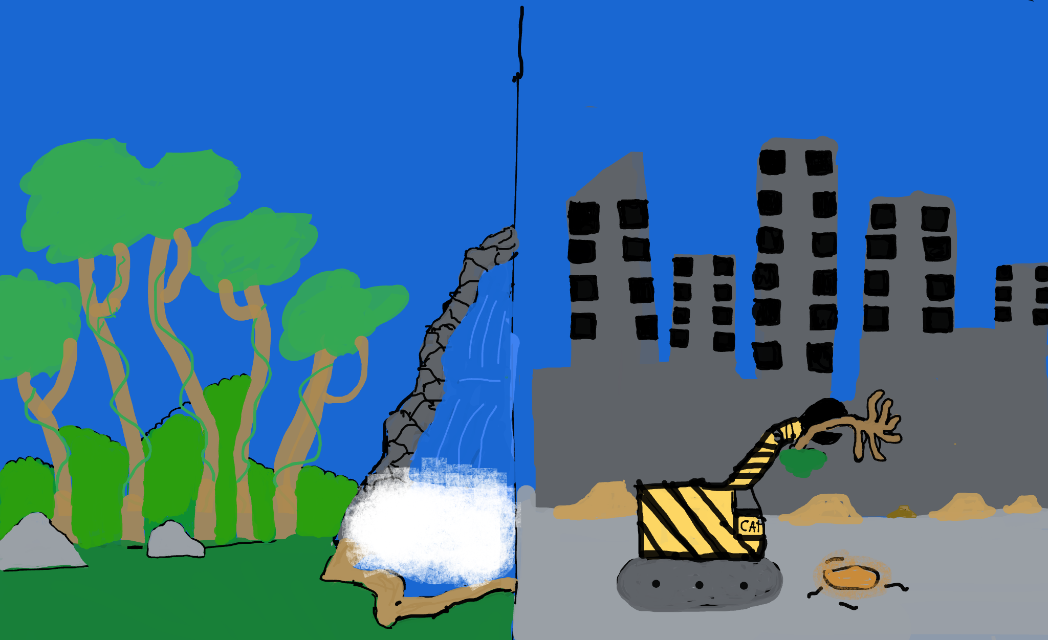 i was inspired by artists Alexis Rockman art work they were so creating and fun i want to do similar idea like Mr. Alexis Rockman i create art work of deforestation of tree because it important to have tee without we will not able to breath air right it important not to burn and cut to many tree before you can hurt plants and animals home and plus us. want the viewer to know about this artwork because it important to have tree because we need tree to breath healthy air and to live.