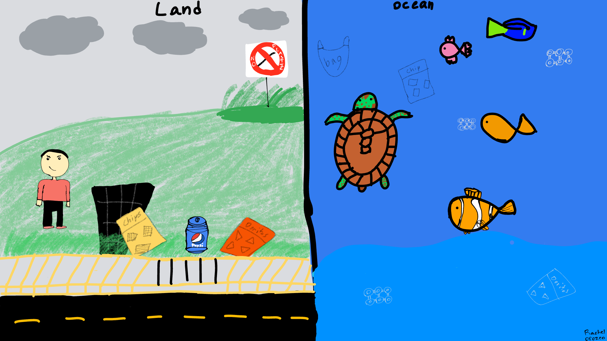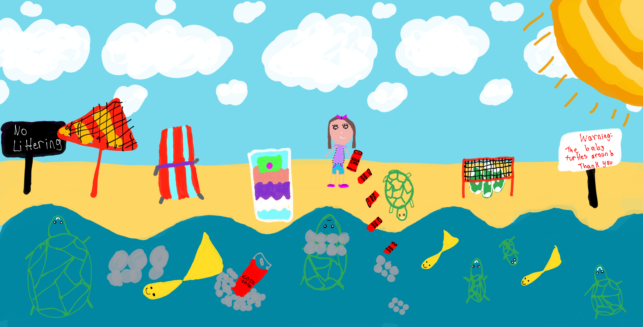 I did this drawing by thinking that theres a lot of people who doesn’t take care of the place where they live and dont really start thinking about animals animals also have feelings and we have to take care of turtles and other animals in the water and on the world