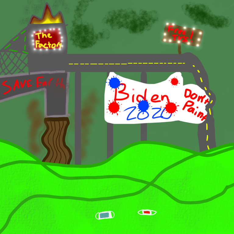 My art work is about how our world and society is just falling apart. People believe anything and that why I put the free tv’s. People don’t respect everyone’s beliefs, thats why I put the Biden flag with paint because it’s my belief and some people don’t agree with it. I put the masks in the water because people don’t know how to correctly discard the things they use through Covid-19. And I out the factory on fire because we as a society are harming the earth and polluting the air. And I put the pipe pouring brown water into the already dirty water because people dump oil and petroleum into the water.
