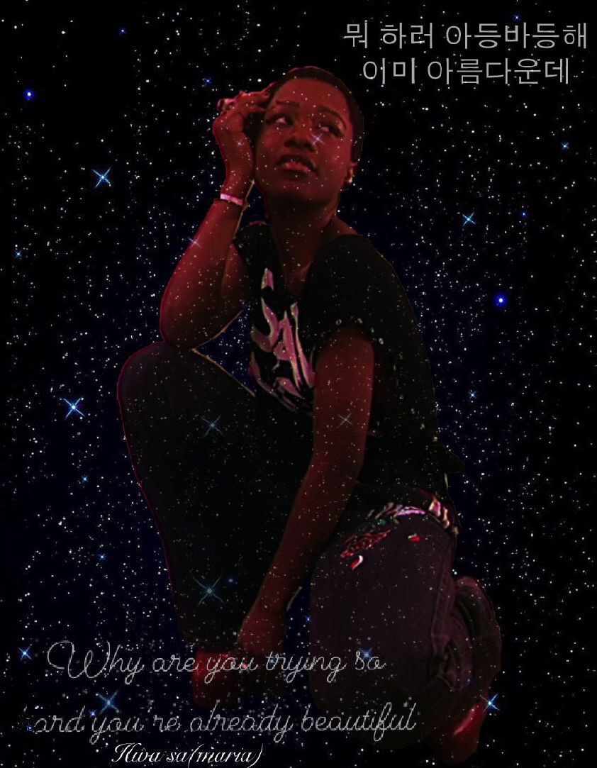 My intention is to be subtle and relatable but also empowering to my peers and many others.My work was inspired by 2 of my top idols my close aunt and an artist that goes by the name of hwa sa to me they are both beautiful, confident, and hard working I aspire to be like them in these ways.I want everyone that views my art to know that it’s ok to not be ok you’re not always gonna look 100% and that’s ok be nice to yourself and others and remember it starts with you.