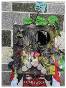 My intention is to let people know that we should stop polluting the world and stop throwing trash on the streets or anywhere because then the trash goes into the drain and into the ocean and it affects all the animals because they either eat it and think it’s food or they get stuck on the trash. Something that inspired my work was seeing the trash on the streets and seeing pictures of little baby animals getting stuck on different types of trash. I want the viewer to know that I care about the environment and about the animals who can get hurt because of our bad choices that we sometimes make.