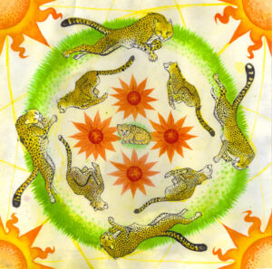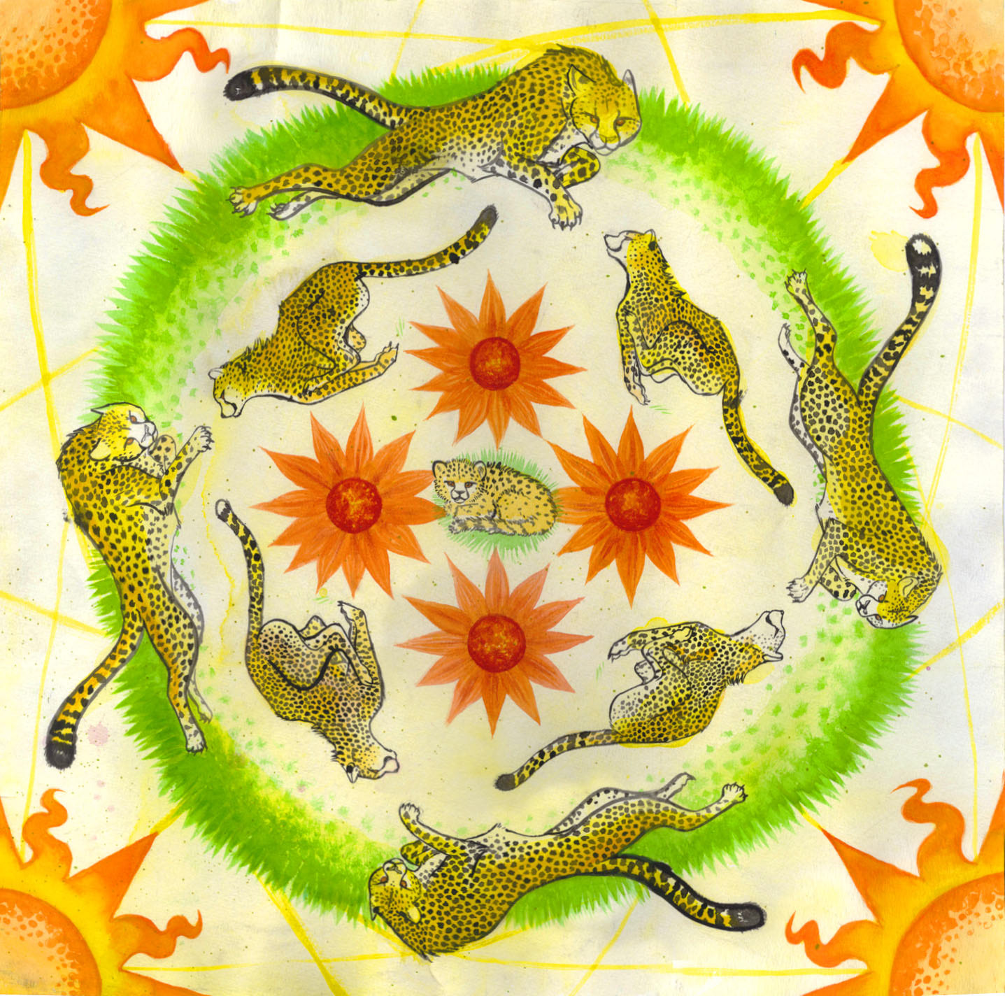 This work is an homage to my favorite childhood mammal and the fastest land animal on earth, the majestic cheetah. Inspired by the cycles of growth that begin the moment we are born, this sunny panel of circling cheetahs beams neon colors into the room. The ring-like green and yellow grass design invite contemplation on the experience of growing through motifs of flowers, the sun, and the cheetah itself appearing at different ages. Mostly though, this work is about appreciating the adorableness of baby cheetah cubs.