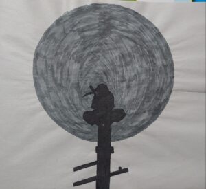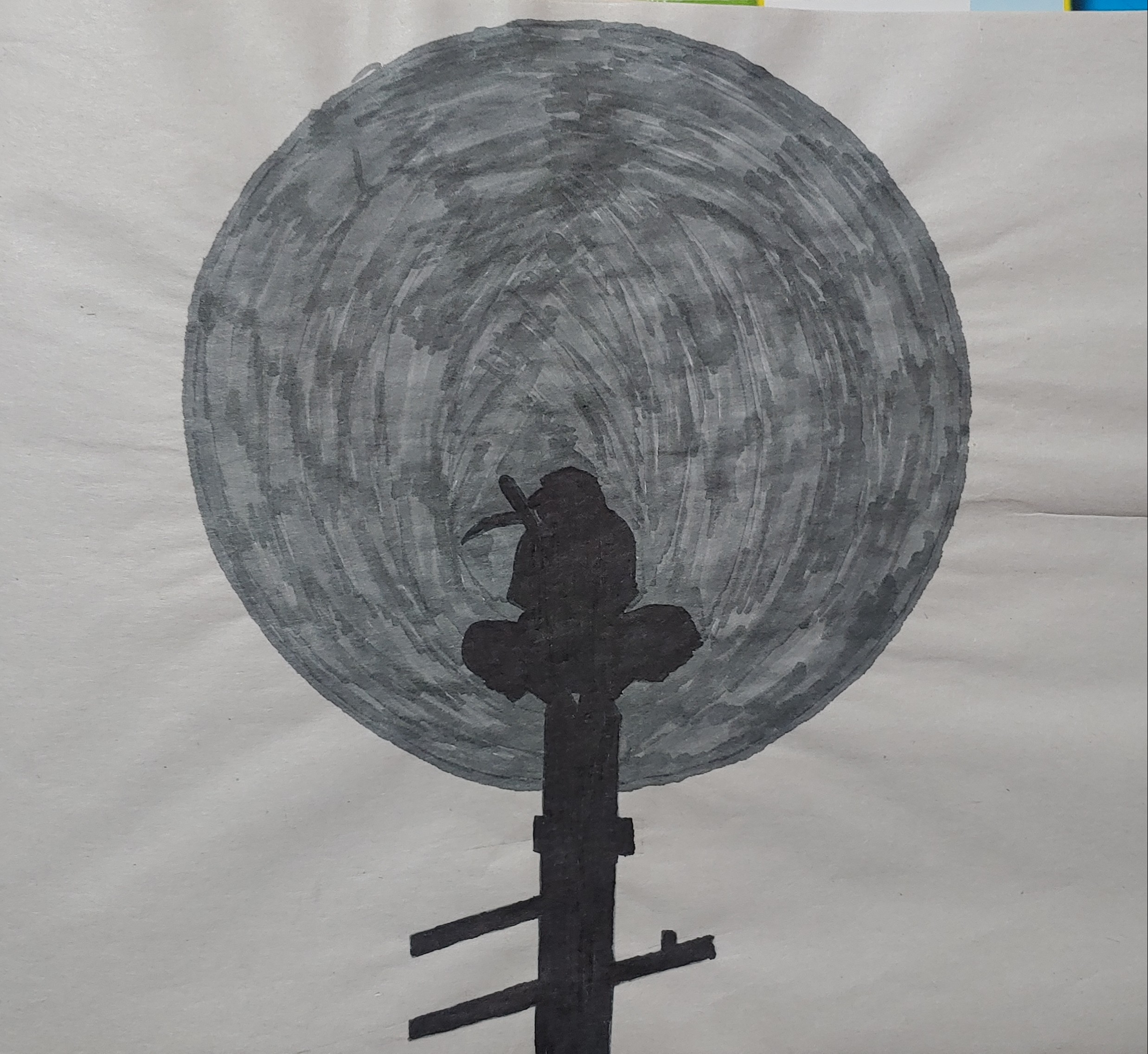 This drawing is about a anime name Naruto when this character had to slaughter his clan to protect his village.