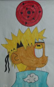 this is a drawing about an anime name Naruto and the drawing is the main character which is Naruto.
