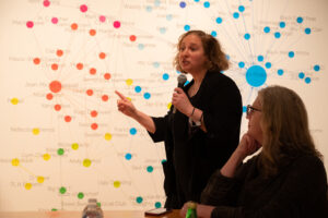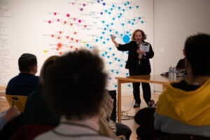Researchers Lee Boot, Christine Mallinson, and their research teams held intimate discussions about two critical research activities at UMBC, focused on the topics of climate science and Deep Fake audio technologies. Both of these interdisciplinary research activities used visualization strategies to interpret and understand important changes in our environment and culture. The format of the conversation was a gallery tour followed by Q+A.