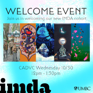 On October 30, 2024, from 12–1:30 pm, the Center for Art, Design and Visual Culture hosted an event to welcome the new Intermedia and Digital Arts (IMDA) Graduate Students. The event featured micro research talks by artists such as Mary Ryan Budnitz, a Baltimore-based animator who explores themes of body positivity through digital animation using the monstrous and fantasy, and Jaslyn Tabourne, a multimedia artist inspired by her faith to create narrative works. Filmmakers Brittney Barbour and María Sánchez shared insights into their video art, and Rokhsareh Alvandi presented aspects of her multidisciplinary practice influenced by her Iranian heritage. The talks were followed by a mixer, with refreshments provided.