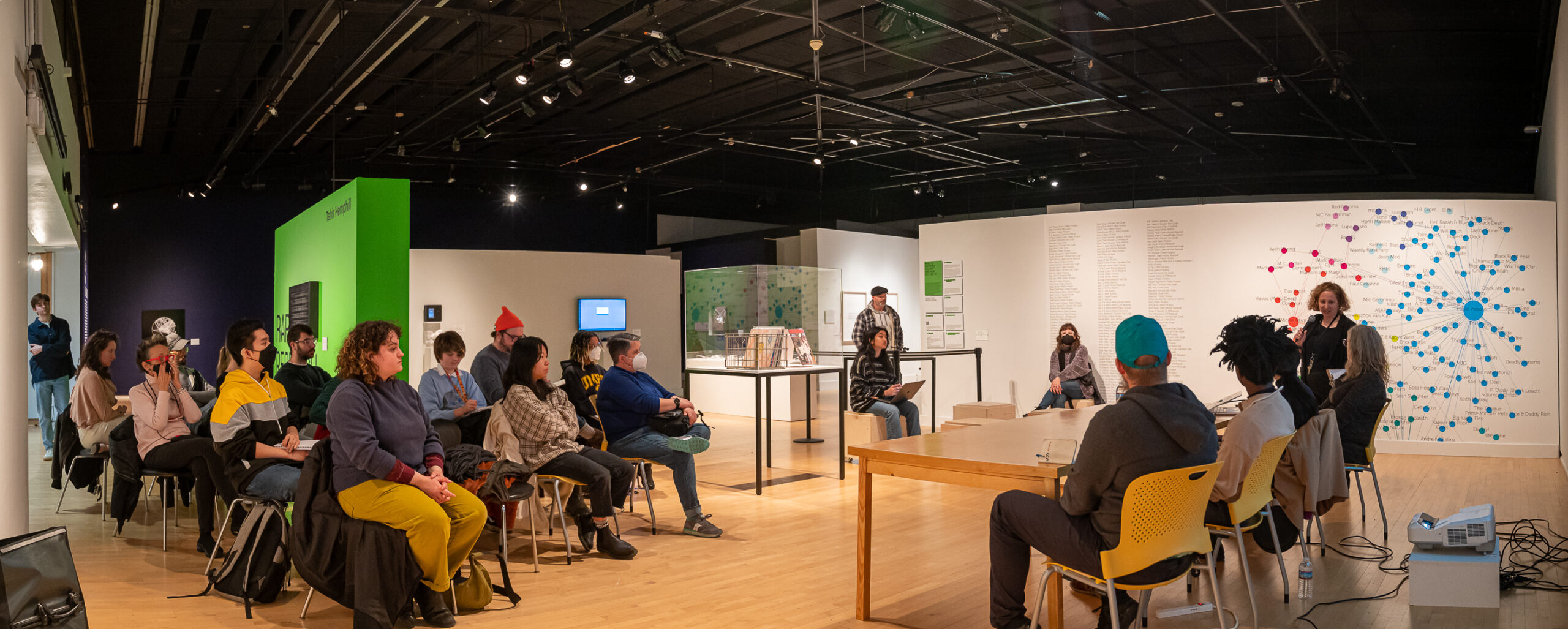 Researchers Lee Boot, Christine Mallinson, and their research teams held intimate discussions about two critical research activities at UMBC, focused on the topics of climate science and Deep Fake audio technologies. Both of these interdisciplinary research activities used visualization strategies to interpret and understand important changes in our environment and culture. The format of the conversation was a gallery tour followed by Q+A.