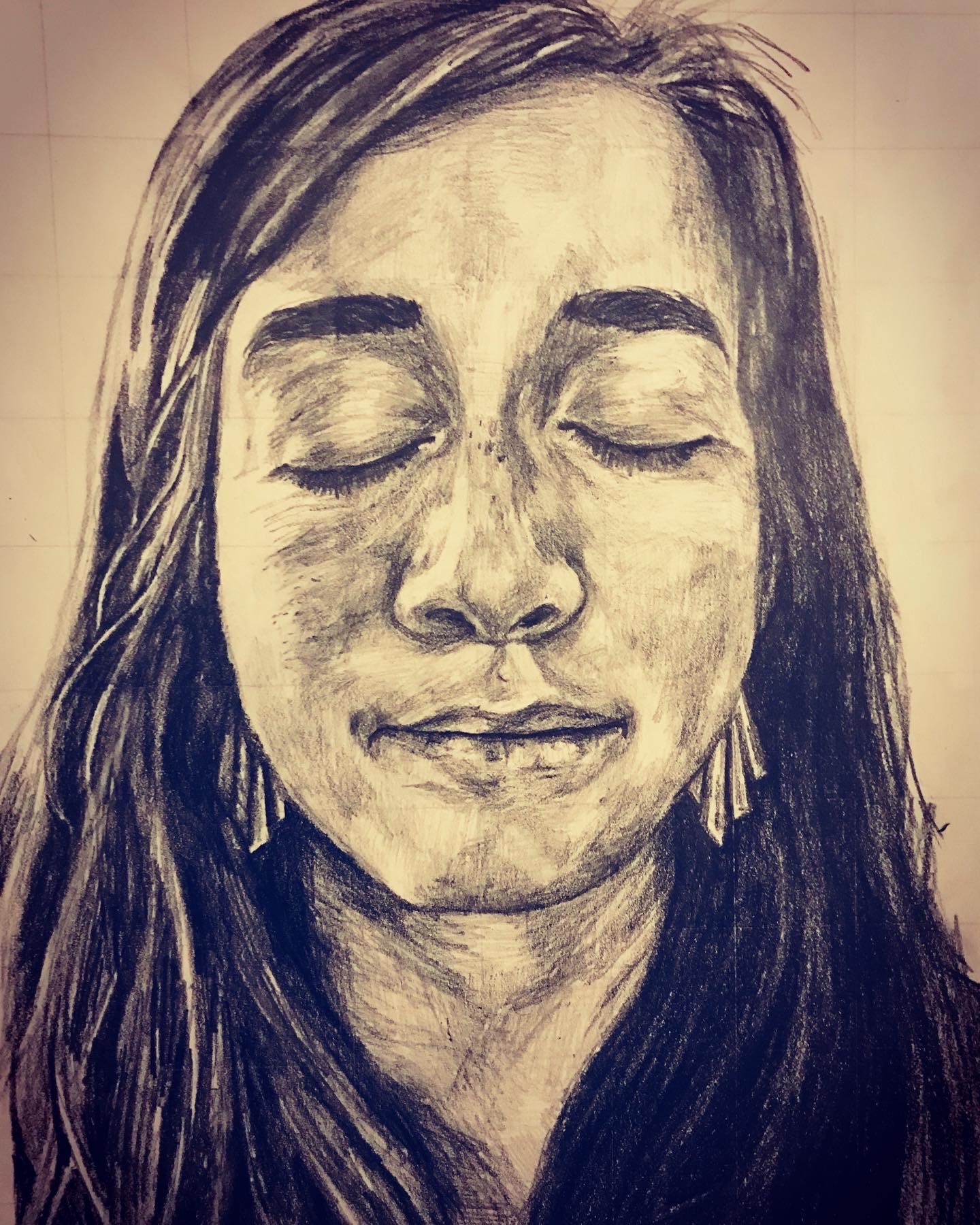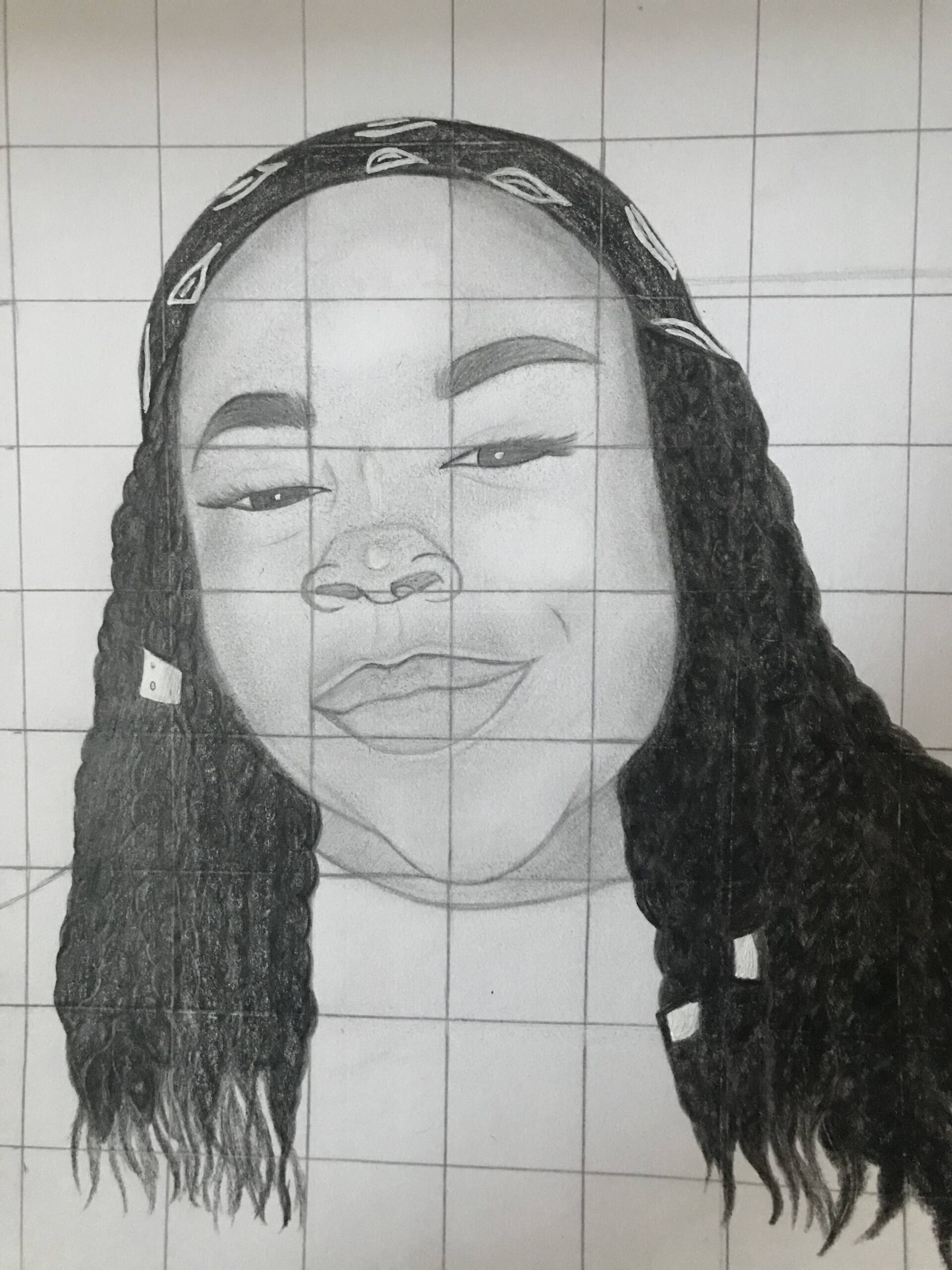 Teaching and practicing social emotional learning skills like mindfulness and meditation with my students is very important to me. I chose to draw myself experiencing a peaceful, centered moment. Drawing the shapes, lines, shadows, mid-tones, and highlights of each grid-square as they are, without interpretation, is very similar to meditation. In meditation, we try to see our thoughts, feelings, body sensations as simply what they are. Doing so helps me be at ease and grounded in each moment.